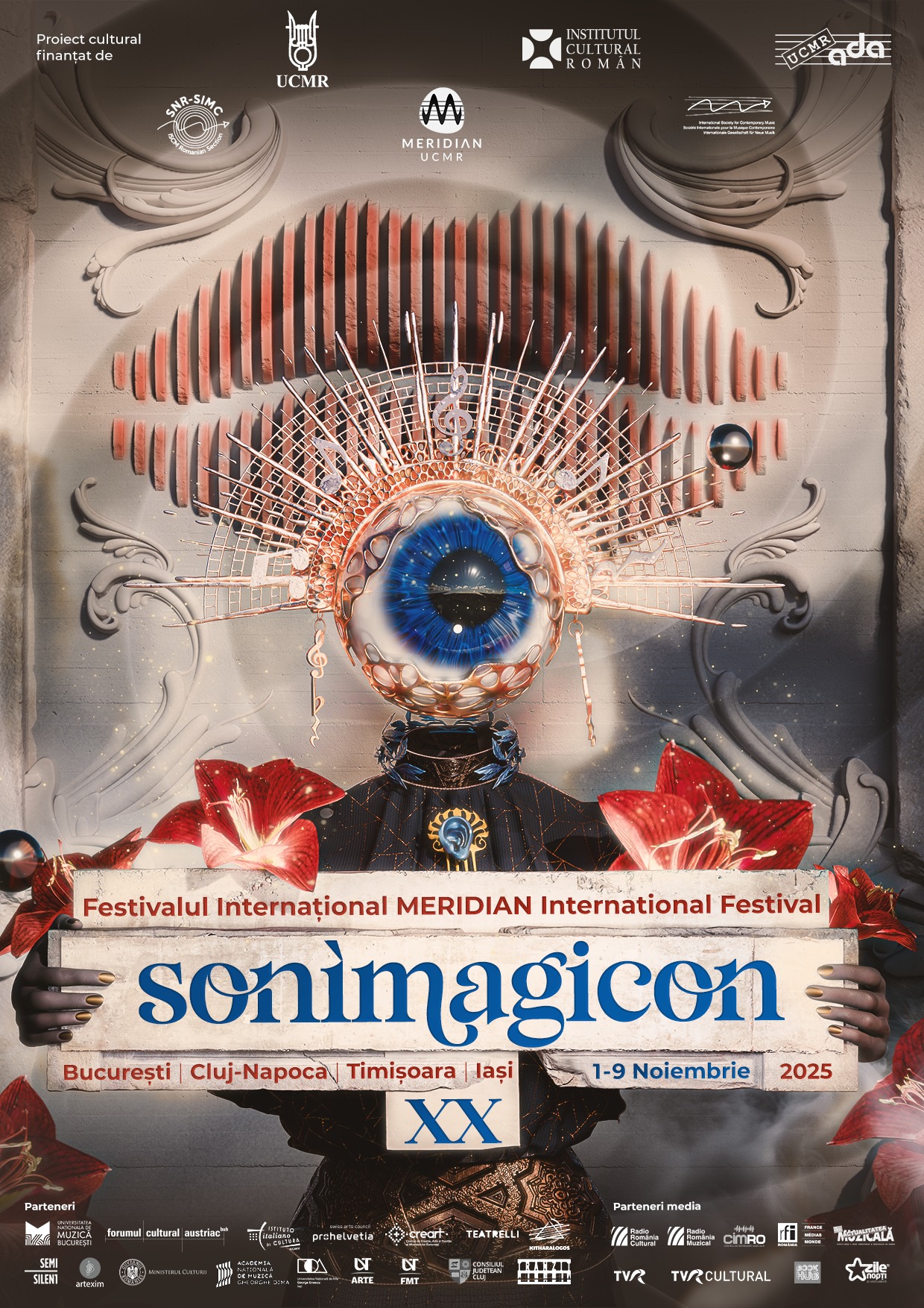 Uniunea Compozitorilor şi Muzicologilor din România aniversează anul acesta 20 de ediţii ale Festivalului Internaţional MERIDIAN, care și-a câștigat notorietatea în rândul celor mai importante evenimente din țară dedicate muzicii noi. În 2025, festivalul se va desfășura între 1-9 noiembrie cu tema SONIMAGICON: Sunet, Imagine, Magie, Icon(ic). Stabilit în ultimii ani drept un festival cameral axat pe colaborări interdisciplinare şi pe muzica electronică, MERIDIAN, organizat prin SNR-SIMC, îşi propune să atragă publicul din Bucureşti, Cluj-Napoca, Timişoara şi Iaşi către colorata şi mereu surprinzătoare lume a creației muzicale actuale printr-un program inedit şi divers care conține 28 de evenimente cu titluri și propuneri incitante.